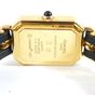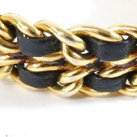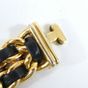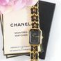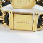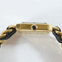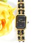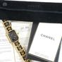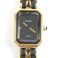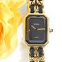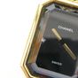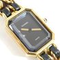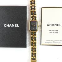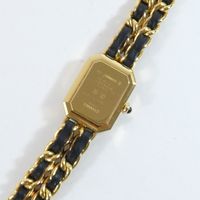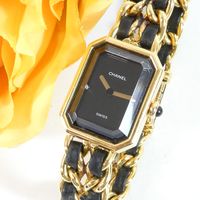 CHANEL. Bracelet-montre « Première » : en métal doré. Boîtier octogonal (26 x 20mm environ). Cadran noir sans index. Mouvement à quartz. Fond clippé. Bracelet double rang de chaînes en métal doré entrelacées de cuir noir. Remontoir serti d'un cabochon d'onyx. Signé et numéroté. Tour de poignet : 17 cm environ. Taille L. Pochette, certificat d'authenticité. Rayures, éclat au verre. La montre Première de CHANEL iconique : Inspirée des codes de la Maison, cette création aux lignes singulières évoque le bouchon du parfum N°5. Le bracelet souple aux maillons entrelacés de cuir rappelle la chaîne du sac classique avec les deux couleurs de la Maison : le noir et l’or.
