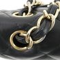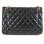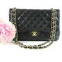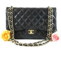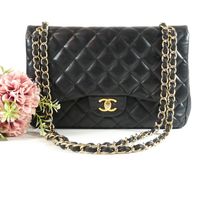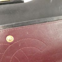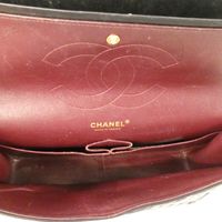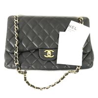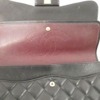 CHANEL. Modèle « Classique à double rabat » : taille Jumbo 30cm, Circa 2011. Sac en cuir lisse matelassé noir, anse chaîne en métal doré entrelacée de cuir assorti, ajustable pour un porté main, épaule ou bandoulière. Fermeture à rabat, fermoir CC en métal doré (la partie pivotante dédorée). Poche plaquée au dos. Intérieur en cuir bordeaux comprenant 2 compartiments, double rabat intérieur surpiqué du double C, une poche zippée, une double poche plaquée, un passant à rouge à lèvres, marque : « Chanel® Made in France ». Hologramme numéroté, pas de carte d'authenticité. H : 20 x L : 30 x P : 9cm environ. Traces et usures à l’intérieur et l'extérieur, usures en dessous et aux coins. Facture Chanel (2011).