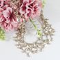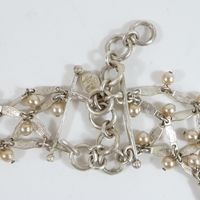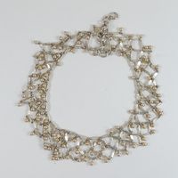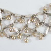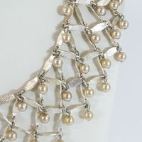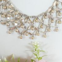 Christian DIOR Boutique. Collier draperie : en métal argenté ponctué de perles imitation rosées. Circa 1997 (?). Ajustable au niveau longueur avec 4 anneaux (de 35 à 39cm environ). Signé "Christian Dior Boutique" sur plaquette.