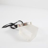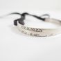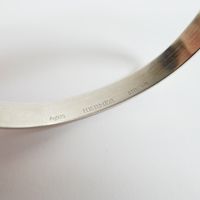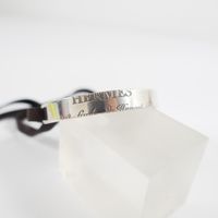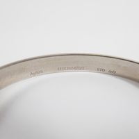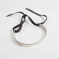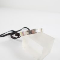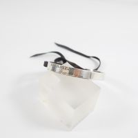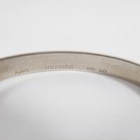 HERMES. Bracelet "Cartouche" : en argent 925 mil. formant un jonc plat ouvert gravé «Hermès 24 Faubourg Saint Honoré Paris» se fermant par un lien de cuir à nouer. Poids brut 11g.
