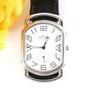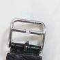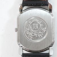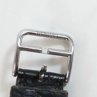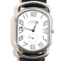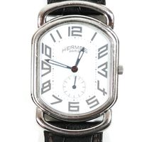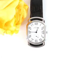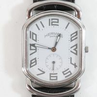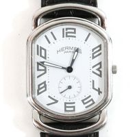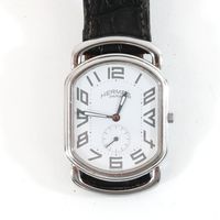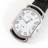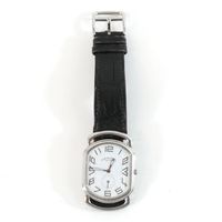 HERMES. Bracelet-montre d'homme "Rallye" GM : Réf. RA1 810. Boitier ovale en acier (38 x 31 mm) cadran blanc, chiffres arabes stylisés, trotteuse à 6h, mouvement quartz, bracelet en cuir (*) noir usagé HERMES, boucle ardillon en acier signé. Rayures. Sans écrin, ni papier. La montre Rallye, dont les attaches articulées suggèrent le mors du cheval.