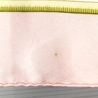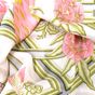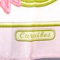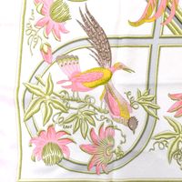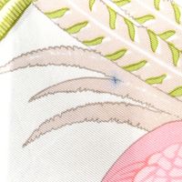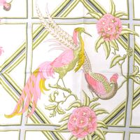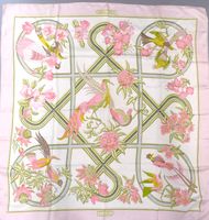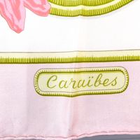 HERMES. Carré en twill de soie imprimée titré "Caraïbes": par Christiane VAUZELLES, éditée pour la 1ère fois en 1974, dans les tons rose et vert sur fond blanc. Taches, fils tirés. Sans étiquette. 90 x 86cm environ.