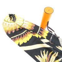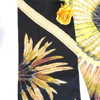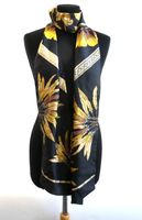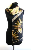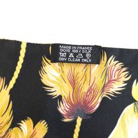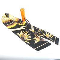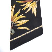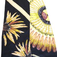 HERMES. Maxi Twilly « Brazil » : en twill de soie à décor de plumes dans les tons jaune, marron, vert sur fond noir, double face. Dessiné par Laurence Toutsy Bourthoumieux. 20 x 220 cm. Etiquette. Boîte. Excellent état. Le Maxi-Twilly peut être utilisé de plusieurs façons, comme écharpe, tour de cou, ceinture ou bandeau.
