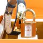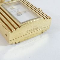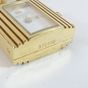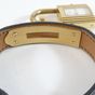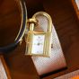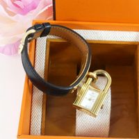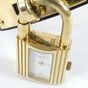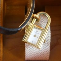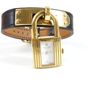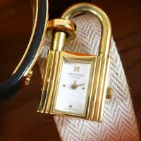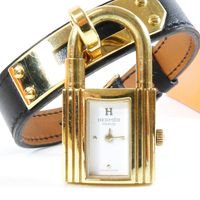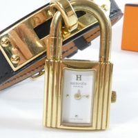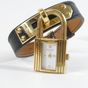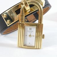 HERMES. Montre bracelet "Kelly" : Réf.3901. Boitier (20mm environ) de forme cadenas en métal doré cannelé. Cadran blanc à index, mouvement à quartz. Signée et numérotée. Bracelet en cuir noir Hermès, boucle ardillon métal doré non signée. Tour de poignet 14 à 17cm environ. Rayures. Ecrin, sans papier. Créée dans en 1975, la montre Kelly se distingue par son boitier en forme de cadenas, une référence directe au célèbre sac du même nom, porté et popularisé par l'actrice Grace Kelly elle-même.