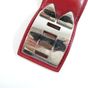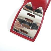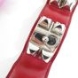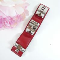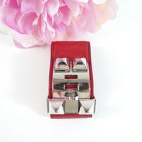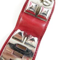 HERMES Paris. Bracelet-manchette "Collier de Chien" : en cuir rouge orné des iconiques clous Médor et d'un anneau en métal doré ainsi que d'une attache réglable à l'arrière. Made in France. Largeur 4cm. Longueur totale : 20,5cm environ. Trous de 16 à 18cm environ. Rayures, usures. En 1927, une audacieuse cliente de la maison recherche une ceinture pour accessoiriser ses tenues. Elle demande à faire allonger un collier de chien qui inspire à la maison une ceinture ornée de têtes de clou aux quatre facettes bombées appelés clous Médor et d’un anneau. La pureté de ses lignes et ses volumes ont donné naissance au bracelet "Collier de chien."