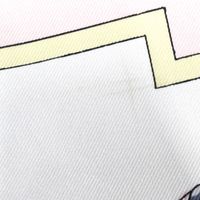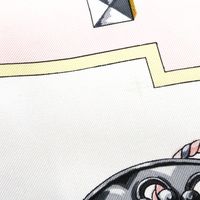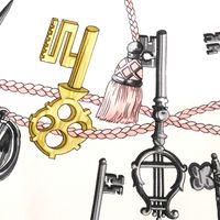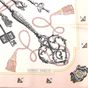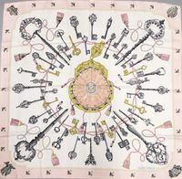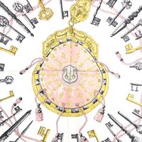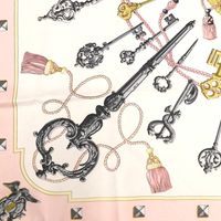 HERMES Paris. Carré en twill de soie imprimé à décor de "Clés": argentées, galons et pompons roses sur fond blanc, bordure rose pâle. Sans étiquette. Quelques taches. 86 x 89cm. Dessin de Cathy LATHAM, imaginé en 1965. Carré emblématique de la Maison Hermès. Il y a 47 clés. Elles seraient toutes authentiques : l’une ouvrait les portes de Notre Dame de Paris, une autre fut offerte au Gouverneur des Pays-Bas au nom de Charles III et d’autres encore sont conservées dans la collection Emile HERMES. La complexité des pannetons (extrémité qui tourne dans la serrure) permet d’imaginer l’importance des secrets qu’elles protègent.