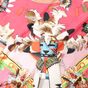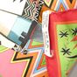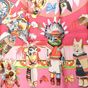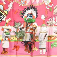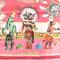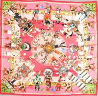 HERMES Paris. Carré en twill de soie imprimé, titré « Kachinas »: dans les tons rose, jaune et vert, signé Oliver (Kermit). 88 x 89cm environ. Sans étiquette. Quelques taches, un peu jauni au centre. Les Kachinas ou petites poupées figurent les esprits familiers pour les indiens du Sud-Ouest des Etats-Unis. Il en existe une centaine qui ont toutes une fonction particulière : l’un punit les enfants qui ne sont pas sages, un autre aide les chasseurs ou fait pleuvoir, …