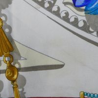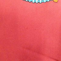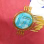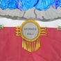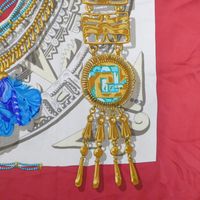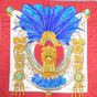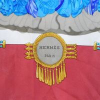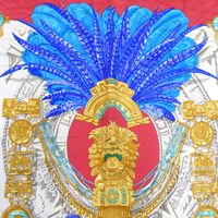 HERMES Paris. Carré en twill de soie imprimée « Mexique »: d'après un dessin de Cathy LATHAM de 1985. Fond blanc-crème et bordure rouge. Symbolisant un totem Maya doré, plumes bleues et bijoux en turquoise. Sans étiquette. Taches. 88 x 86cm.
