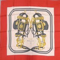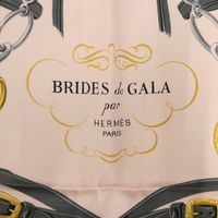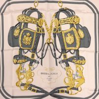 HERMES Paris. Carré en twill de soie imprimée, titré "Brides de Gala" : d'après Hugo Grygkar, dessin gris anthracite et doré, bordure rouge 89 x 88cm environ. Sans étiquette. Taches, fils tirés. Boîte Hermès. Grand classique de la Maison Hermès, « Brides de Gala » a été créé en 1957 : Deux brides d’apparat de la seconde moitié du XIXème se font face. Délicatesse des décors ciselés, armoiries, feuillages, sirènes et travail du cuir.