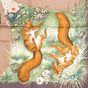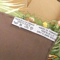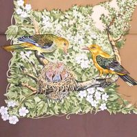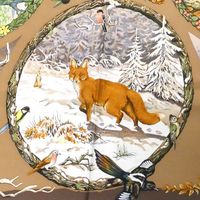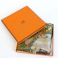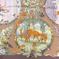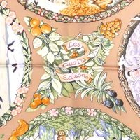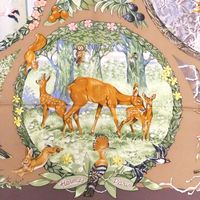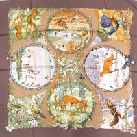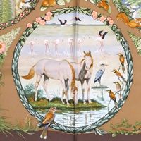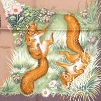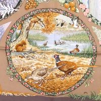 HERMES Paris. Carré en twill de soie imprimée, titré " Les Quatre Saisons": dans les tons vert, rose et marron, signé R.Dallet, à décor végétal et animalier. 86 x 88cm environ. Etiquette. Bon état. Boîte Hermès. Les quatre saisons en un foulard : Le printemps et les hirondelles, l'été tel un envol de flamants roses dans le ciel de Camargue, l'automne arrive avec l'écureuil qui fait ses réserves, le canard venu du nord se pose sur l'étang. L'hiver déploie son manteau blanc ponctué par un renard.
