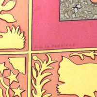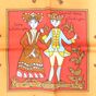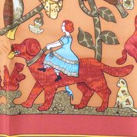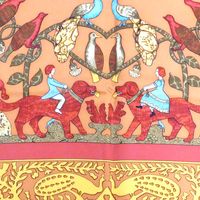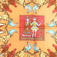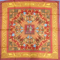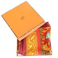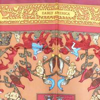 HERMÈS Paris. Carré en twill de soie imprimée, titré "Early America" (II) : ou seconde version, à décor du couple Présidentiel Washington sur fond rouge, signé F de la Perriere. Sans étiquette. 88 x 89cm. Bon état. Boîte Hermès. La version 1981 avec Martha et George Washington n’a jamais été rééditée. Cette édition spéciale commémore les 250 ans de la naissance de Martha Washington, née en 1731. La principale différence graphique par rapport à la 1ère version est l’ajout au centre du carré du couple formé par George et Martha Washington, fondateurs de la jeune république américaine, absents de la version d’origine. Le style du carré, dans ses deux versions, reste fidèle à l’univers délicat de Françoise de la Perrière. Il puise son inspiration dans les motifs symétriques du "Scherenschnitt", cet art du découpage venu d’Europe et popularisé dans les colonies américaines. La seconde version (celle-ci) est plus rare.