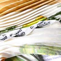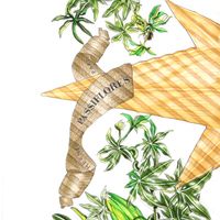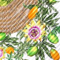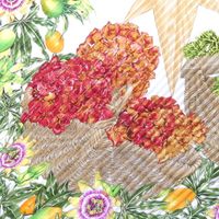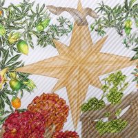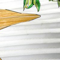 HERMES Paris. Carré en twill de soie plissée, imprimée, titré "Passiflores": sur fond blanc crème, signé V.Dawlat. 86 x 86cm environ. Etiquette. Bon état, taches. Inspiré par l'Ile de Ré où l'artiste Valérie Dawlat-Dumoulin vit, très belle représentation de la Passiflore (appelé comme cela car elle ressemble à la couronne de la passion du christ). Deux paniers de jonc tressé (la bazenne aux hortensias et la gourbeuille de l’amateur de pêche à pied) surmontés d'une rose des vents en acajou taillé.