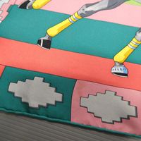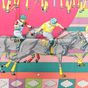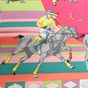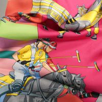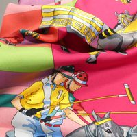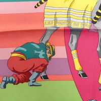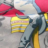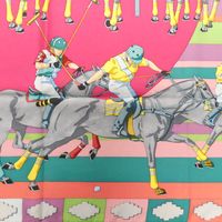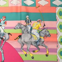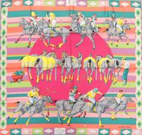 HERMES Paris. Carré en twill de soie titré "Les Poneys de Polo" : dans les tons rose, vert et jaune, signé H.de Watrigant. Roulotté vert. 86 x 89cm. Etiquette. Quelques taches. Petits, musclés et très solides, capables de changer rapidement de direction, les poneys, le plus souvent argentins, sont les acteurs majeurs du polo. Ce carré illustre ces parties extremement intenses. Au centre deux soigneurs veillent sur les montures au repos.Le fond et les bordures du carré rappellent les ceintures typiques d'Argentine avec leur rayures multicolores et leurs tressages géométriques.