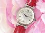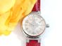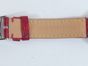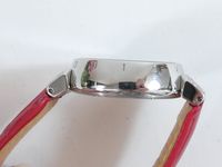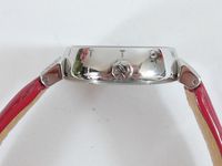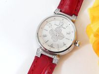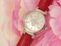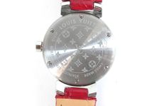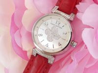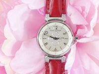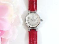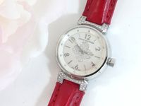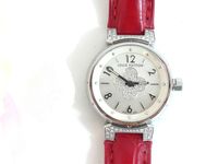 LOUIS VUITTON. Montre bracelet de dame «Tambour» : Réf. Q121P. Boitier rond 28mm environ en acier. Cadran en nacre à décor central d'une "Fleur de Monogram" diamantée, chiffres arabes en applique. Mouvement à quartz. Gravée Louis Vuitton sur la tranche du boîtier. Les attaches autour du boitier pavées de diamants. Bracelet en cuir (*) rouge Louis Vuitton. Boucle ardillon en acier signée LOUIS VUITTON. Très bon état. Sans écrin, ni papier. Version féminine et glamour de la Collection Tambour. Raffinement avec le cadran en nacre, let la Fleur de Monogram diamantée.