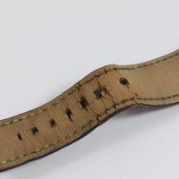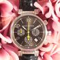 LOUIS VUITTON. Montre bracelet "Tambour Chronographe" : Réf.Q112G. Boitier rond en acier (41,5mm environ). Les attaches sont pavées de diamants. Cadran chocolat à trois compteurs heures, minutes et secondes, chiffres arabes en applique, guichet dateur entre 4 et 5h, trotteuse centrale jaune. Mouvement mécanique à remontage automatique. Gravée Louis Vuitton sur la tranche du boîtier. Bracelet en cuir (*) Vuitton marron, boucle ardillon signée en acier. Rayures. Sans écrin, ni papiers.