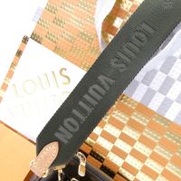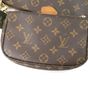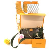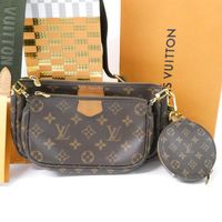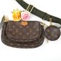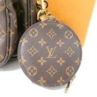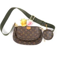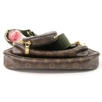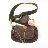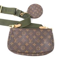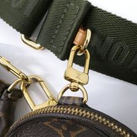 LOUIS VUITTON. "Multi Pochette Accessoires": en toile Monogram et cuir naturel, comprenant deux pochettes amovibles et un porte-monnaie circulaire, chacun ouvrant avec une fermeture zippée. Bandoulière en tissu vert kaki à signature jacquard Louis Vuitton et une anse chaîne amovibles, garniture en métal doré. Intérieur en tissus chocolat. Dans une boite, dustbag. H : 13.5 - L : 24 cm . Ticket de caisse (2022). Bon état général, légères usures fermeture éclair, petites taches.