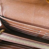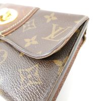 Louis VUITTON. Portefeuille "Boétie" : en toile Monogram et cuir naturel. Rabat à fermoir pivotant orné du sigle LV de la Maison. Intérieur poche zippée, deux compartiments, deux poches plaquées, seize fentes pour les cartes. Garniture métal doré (partiellement dédoré sur fermoir). H : 11 x L : 20,5 x P : 2 cm environ. Usures, cuir patiné, déformations, fils tirés. Dustbag, boîte et facture Vuitton 2011.