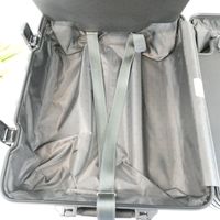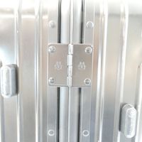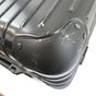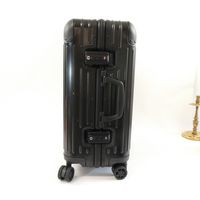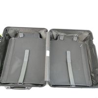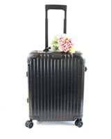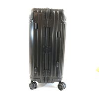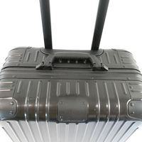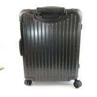 RIMOWA. Valise cabine noire à roulettes : aluminium, design rainuré emblématique, deux poignées de portage, une poignée télescopique, deux serrures à levier avec combinaison TSA. Intérieur deux plateaux de séparation système "Flex-driver" ajustable en fonction du volume de vos vêtements pour un meilleur maintien. H : 55 (avec les roues) x L : 40 x P : 23 cm environ. Dustbag. Usures sur l'extérieur.