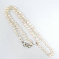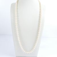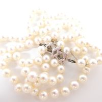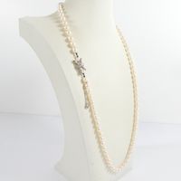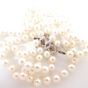 Collier de perles de culture : d'un rang, fermoir serti de perles de culture et de diamant taille rose et chaînette de sécurité en or gris 750 mil. (longueur : 64,5 cm environ) (diamètre perles : entre 6 et 6,5 mm environ). 31,3 g. brut