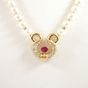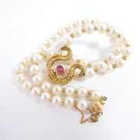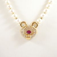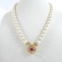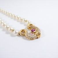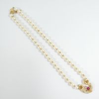 Collier de perles de culture : d'un rang alterné de viroles et centré d'un motif serti de diamants taille brillant et d'un rubis ovale ; fermoir, chaînette de sécurité, viroles et motif en or 750 mil. (longueur : 39 cm environ) (dimensions motif : 22 x 22 mm environ) (diamètre perles : 6,3 mm environ). 25,6 g. brut