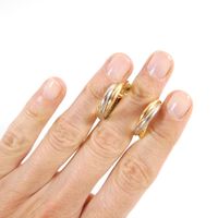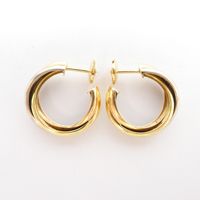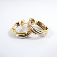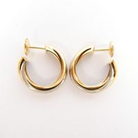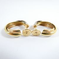 Paire de créoles ouvertes : en trois ors 750 mil. composées de trois anneaux entrelacés, systèmes ALPA, poinçon d'atelier Lucien PONCE ayant travaillé pour CARTIER (diamètre : 22 mm environ). 8,3 g.
