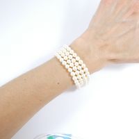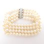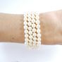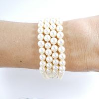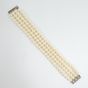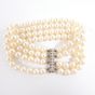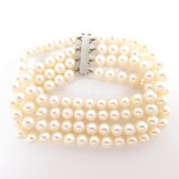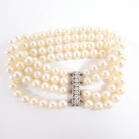 Travail français des années 1960 : Bracelet de perles de culture de quatre rangs, fermoir barrette en or gris 750 mil. serti de diamants taille brillant (longueur : 19 cm environ) (longueur fermoir : 22,2 mm environ) (diamètres perles : de 6 à 6,4 mm environ) (traces de colle sur le fermoir et les diamants). 43,5 g. brut