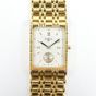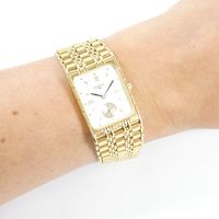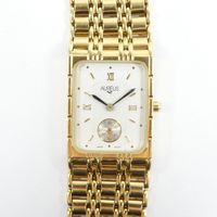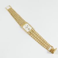 AUREUS : Bracelet - montre de dame en or jaune 750 mil., boîtier rectangulaire, cadran à fond blanc, chiffres romains et index bâton. (Dim. : 28 x 23 mm environ). Bracelet à maille articulé. Mouvement quartz. (Tour de poignet : 19 cm environ). Poids brut : 69g