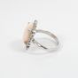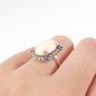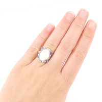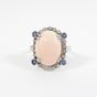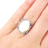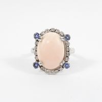 Bague : en or gris 750 mil., orné d'un cabochon de corail, entourage de petits diamants taille brillant et ponctué de petites pierres bleues. Anneau facetté. (TDD : 54,5). Poids brut : 5,8g.