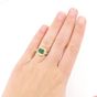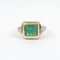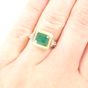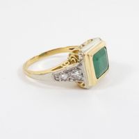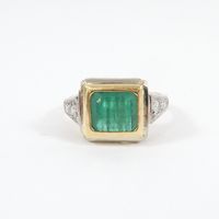 Bague : 2 ors 750 mil. sertie d'une émeraude rectangulaire, épaulée de diamants taille 8/8 (dimensions du chaton : 1 x 1,2 cm) (TDD : 51) (fêle). 4,5 g. brut.