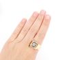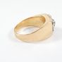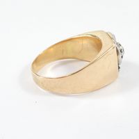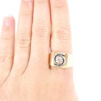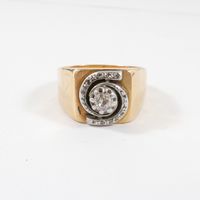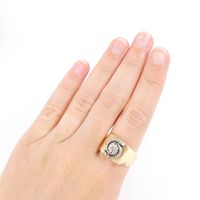 Bague chevalière : 2 ors 750 mil., centrée d'un décor à volute sertie de petits diamants taille rose et d'un diamant taille ancienne. (0,30 carats environ). (Traces de mise à taille, fêles, déformée). (TDD : 67). Poids brut : 11,3g