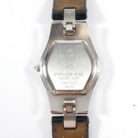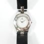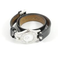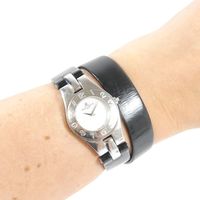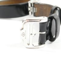 BAUME & MERCIER, Linéa : Montre-bracelet de dame en acier, boîtier rond (diamètre : 24 mm), lunette gravée de chiffres arabes, cadran muet gris irisé, mouvement à quartz, sur bracelet à double tour en cuir glacé noir usagé à boucle ardillon siglée.