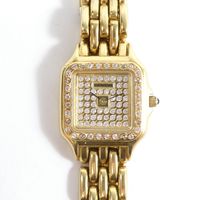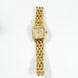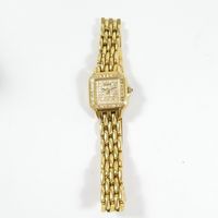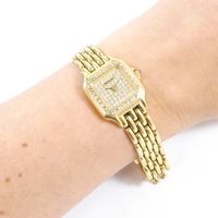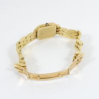 GENEVE : Bracelet-montre en or 750 mil., boîtier carré (22 x 22 mm environ), la lunette sertie de pierres imitation, le cadran muette pavé de pierres imitation, mouvement à quartz, sur bracelet articulé en or 750 mil. à boucle déployante (longueur : 16 cm environ). 56,3 g. brut.