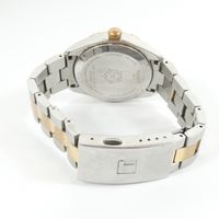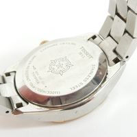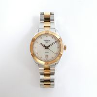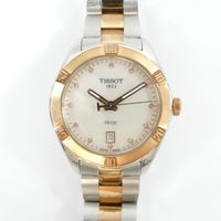 TISSOT, "PR 100" : Bracelet montre en acier et métal doré, lunette circulaire, cadran à fond nacré, index diamanté, guichet dateur à 6h. (Diam : 35mm environ). Mouvement quartz. Bracelet articulé à boucle déployante. (Tour de poignet : 16,5cm environ).