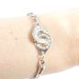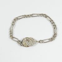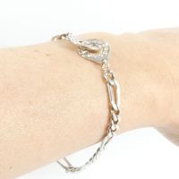 Bracelet : en or gris 750 mil., à maille figaro. Fermoir menottes serti de diamants taille brillant. (0,05 carats environ). (Long. : 18,7cm environ). Poids brut : 13,6g