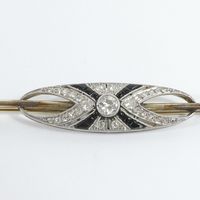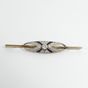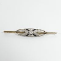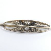 Broche - plaque ovale : en or gris 750 mil., sertie de diamants demi - taille et 8/8, et de pierres bleus d'imitation. (Long. 7,6 cm x 1,6cm). Poids brut : 10,2g