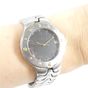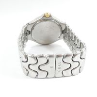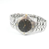 EBEL « Sportwave » : Bracelet - montre en acier, boîtier rond, lunette sertie de vis en métal doré, cadran à fond noir à chiffres arabes appliqués, guichet dateur à 3H, mouvement à quartz, bracelet et boucle déployante papillon signée en acier, signé et numéroté (diamètre : 35 mm) (Tour de poignet : 19 cm environ) (rayures d’usage)