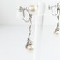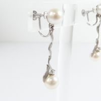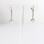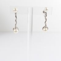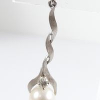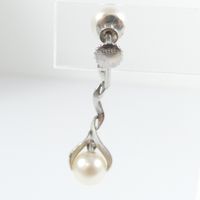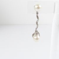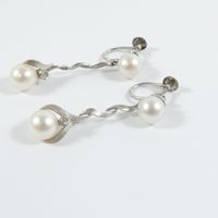 Paire de pendants d'oreille torsadés : en or gris 585 mil., amati et brossé, retenant deux perles blanches de culture, ponctué d'un petit diamant taille brillant (0,03 carats environ), (Long. : 3,2cm environ). Poids brut : 5,2g