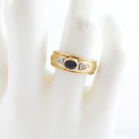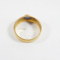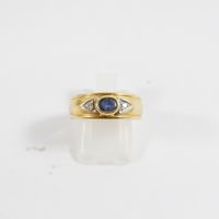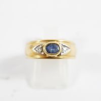 Bague en or 750 mil centrée d'un saphir épaulé de 2 diamants (Larg : 7 mm ; TDD : 54). 3,6 g brut.