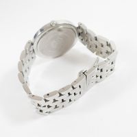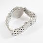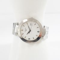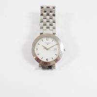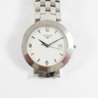 Bracelet-montre en acier, boîtier rond (Diam : 36 mm), cadran blanc à index épis, chiffres arabe et guichet dateur, tour de bras à maillons grain de riz acier articulés (Long : 18 cm environ), LONGINES "Dolce Vita" mouvement quartz (Rayures).